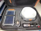 The NEBO Emergency Kit is a versatile unit combining flashlight, headlamp, lantern, and solar battery bank functionalities. It offers a range of 400 to 2000 lumens with three LED lights. Features include magnetic base, waterproof design, rechargeable batteries, wrist strap, and solar power source. The product is in gray color and includes a warning for California Prop 65.