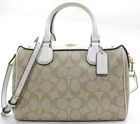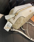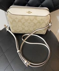 Elevate your accessory game with this stunning Coach Bennett Crossbody bag in Light Khaki/Chalk. Crafted from high-quality coated canvas and leather, this bag boasts a chic and classic design that will complement any outfit, whether it's for travel, party/cocktail, casual, formal, or business occasions. The bag features a gold hardware color and a signature C logo pattern, giving it a touch of elegance. The adjustable strap, detachable strap, brand card, and bag charm are some of the fabulous accessories that come with this bag. The bag has a rectangular shape and a zipper closure. It has a small size, measuring 9.75 inches in width, 6.5 inches in height, and 4.5 inches in depth. The bag's handle drop is 4 inches, and the strap drop is 25 inches. The lining material is also rayon, and the bag comes in its original packaging.