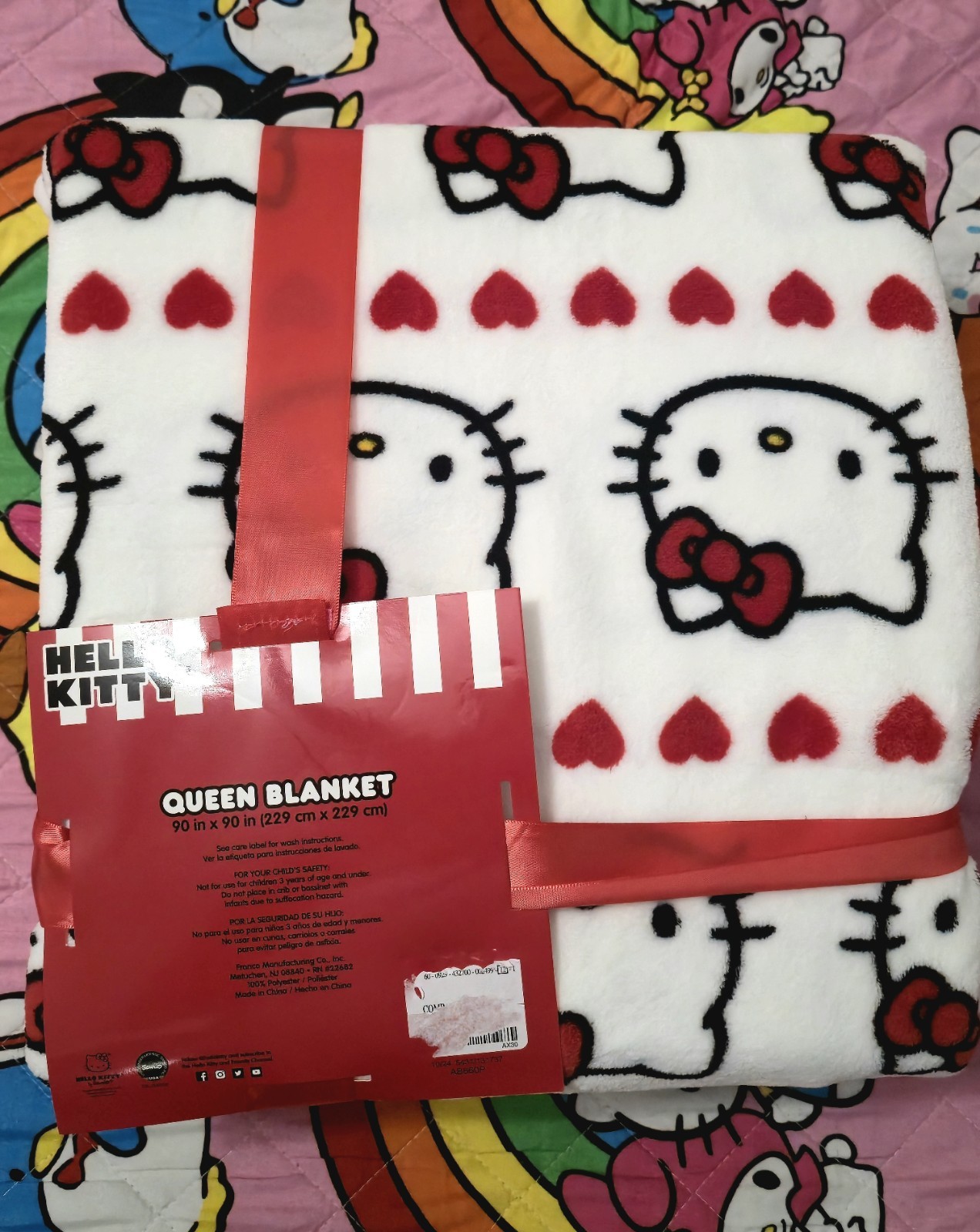 The NEW Hello Kitty Valentine’s Day Queen Blanket features a charming red heart pattern throughout, making it the perfect addition to any bedroom during the Valentine’s season. The 90"x90" size ensures warmth and coziness, while the multicolor design adds a playful touch. With machine wash care instructions, this blanket is easy to keep clean and fresh. Show off your love for Hello Kitty and Valentine's Day with this adorable and festive throw.