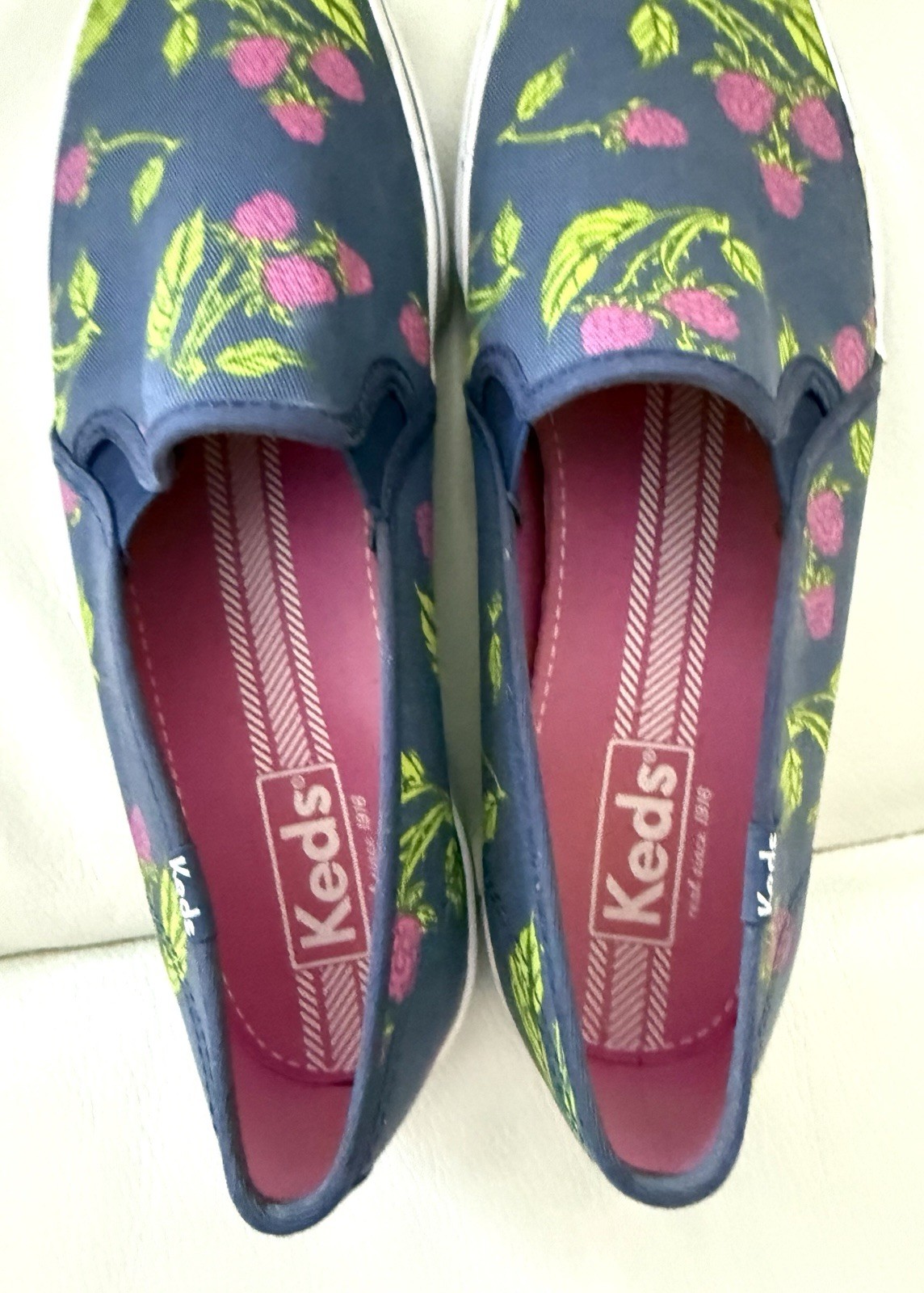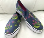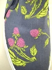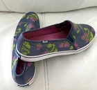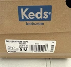 The NIB-KEDS Women Size 9 Double Decker Slip Canvas Fruit Navy Sneakers-are a stylish and comfortable option for casual, work, or travel occasions. Featuring an almond toe shape, slip-on closure, and low heel height, these sneakers offer arch support and a rubber outsole for durability. The black floral canvas design adds a touch of fruit-inspired fun to your outfit, while the ankle shoe shaft style and flat heel make them easy to wear for all-day comfort. Perfect for spring, summer, fall, and winter, these Keds sneakers with a logo accent are a versatile choice for any season. See photos for new in box condition.