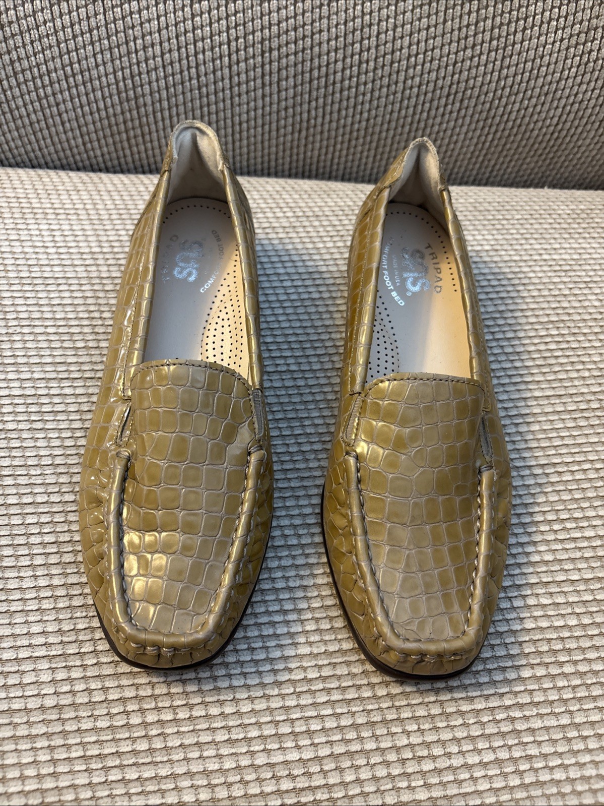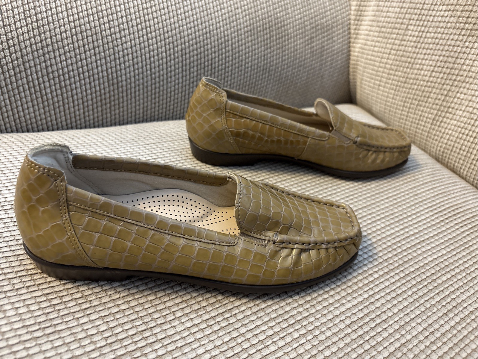 The product is a pair of NWOT SAS Tripad Comfort beige Joy croc print slide-on loafer shoes for women in size 6M. These shoes are designed for comfort with a leather upper material and a flat style. The beige color and crocodile print add a stylish touch to the classic loafer design. The SAS brand is known for its quality and comfort, making these shoes a great choice for women looking for both style and functionality in their footwear.