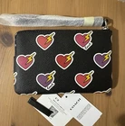 Style Number: CW857 Measurements: Length: 6.25"Height: 4.0"Width: 0.25" Materials: Printed coated canvasFabric liningStrapWrist strap attached Features: Two credit card slotsZip-top closure