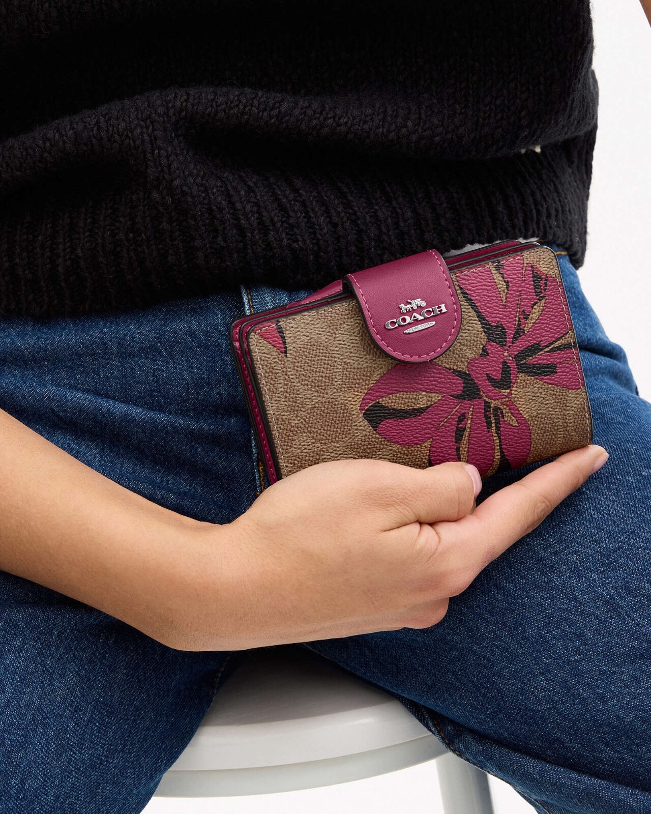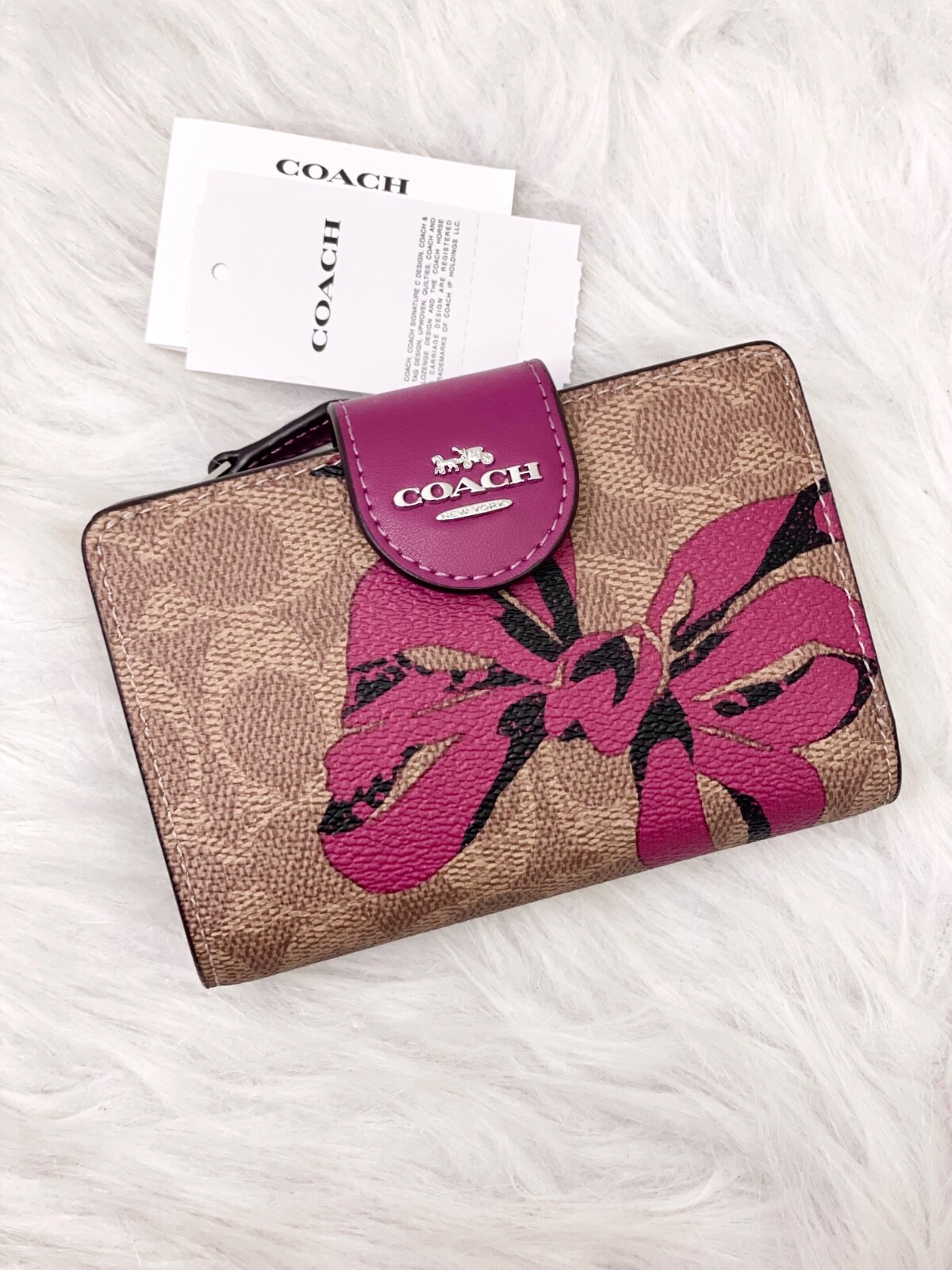 NWT COACH SIGNATURE BOW CORNER ZIP MEDIUM WALLET Fast shipping Brand new with tags 100% Authentic Style Number CZ340 Measurements Length: 5.0" Height: 3.5" Width: 0.5" Materials Signature coated canvas Features Zip coin pocket Seven credit card slots Snap closure Bill compartment Additional Details ID window Price is firm *NOTE: Bow print is randomly arranged, so each wallets may look slightly different m
