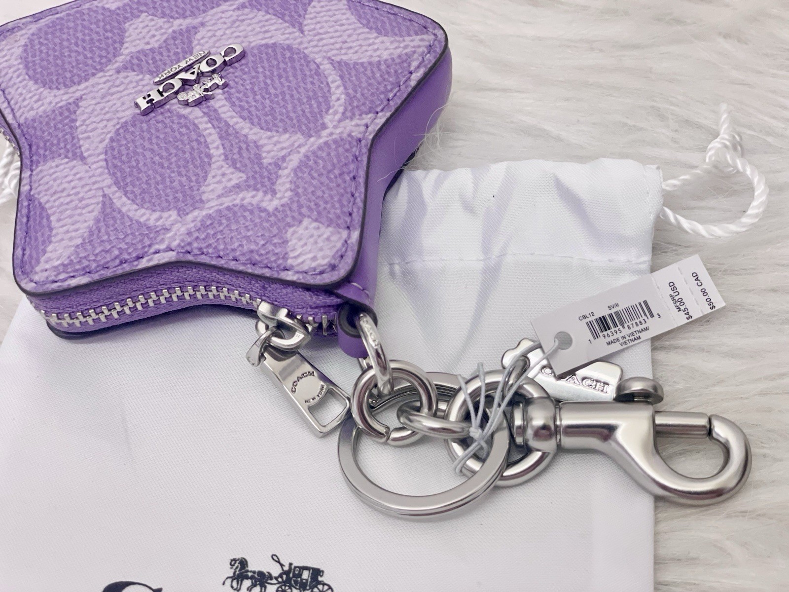 Coach Star Bag Charm In Signature Canvas Brand new with tags 100% Authentic Come with small dust bag Color: Silver/ Iris Style Number: CBL12 Measurements Length: 3.5" Height: 3.25" Width: 0.75" Materials Signature coated canvas and smooth leather Fabric lining Features Zip closure Attached dogleash clip Price is firm