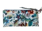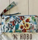 This beautiful Hobo Vida pouch is perfect for any occasion. With a stunning floral and botanic print, this large wristlet/wallet is made of high-quality leather and features a zipper closure. The bag measures 10.25 inches in width and 5 inches in height, making it a great size for travel, parties, weddings, or everyday use. The pouch comes with a key chain, coin purse, and original dust bag, as well as inner pockets for added organization. The handle and strap are made of leather with a multi-color design, while the hardware is silver tone. The bag is lined with leather and fabric in a blue color, adding a pop of color to the white exterior. This designer piece is a must-have for any fashion-forward woman.