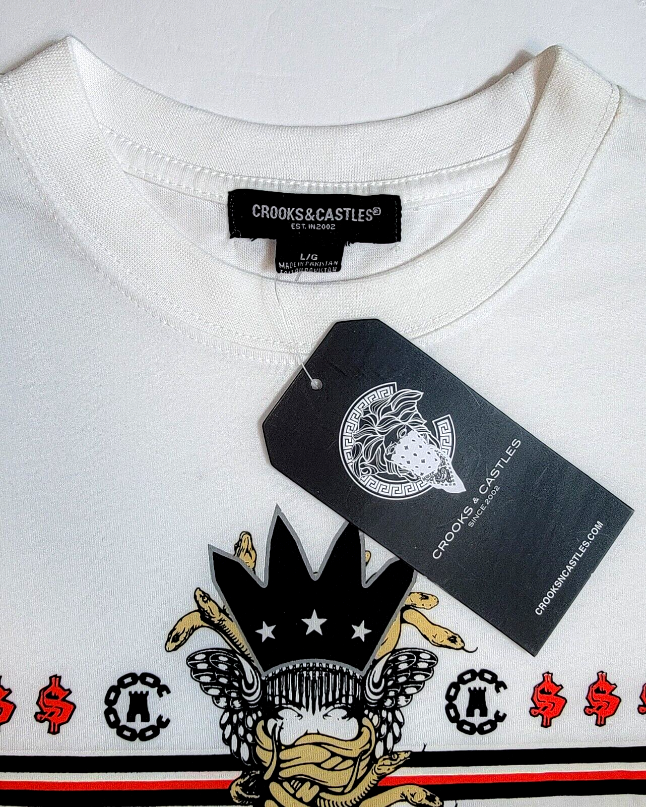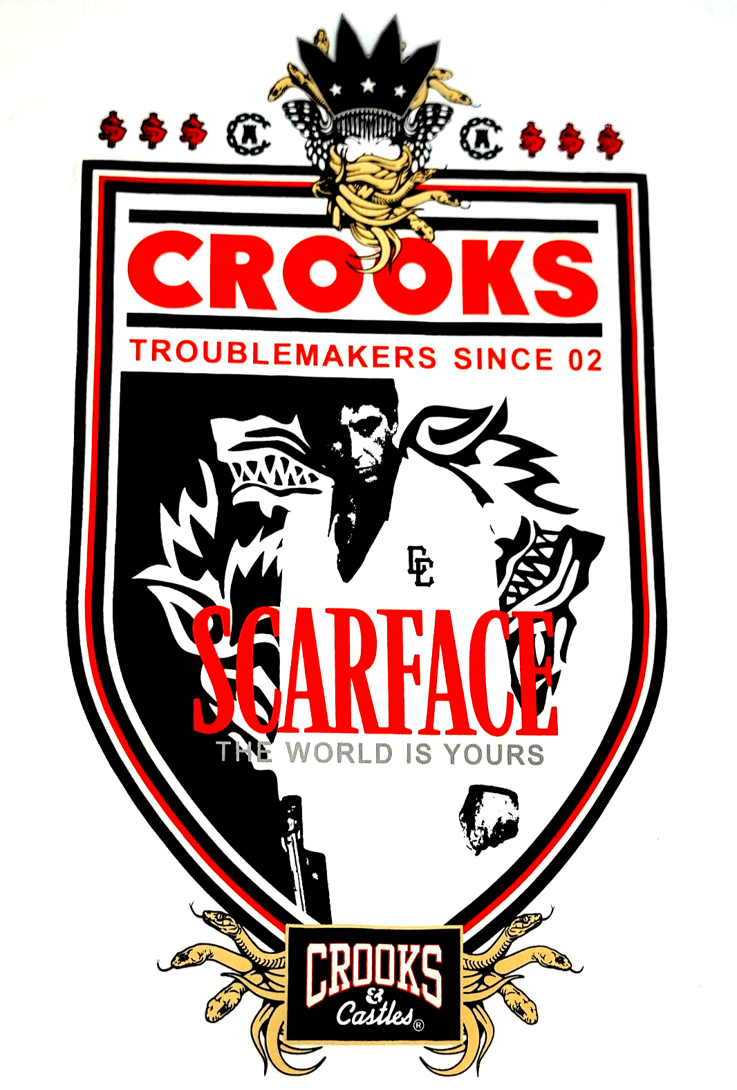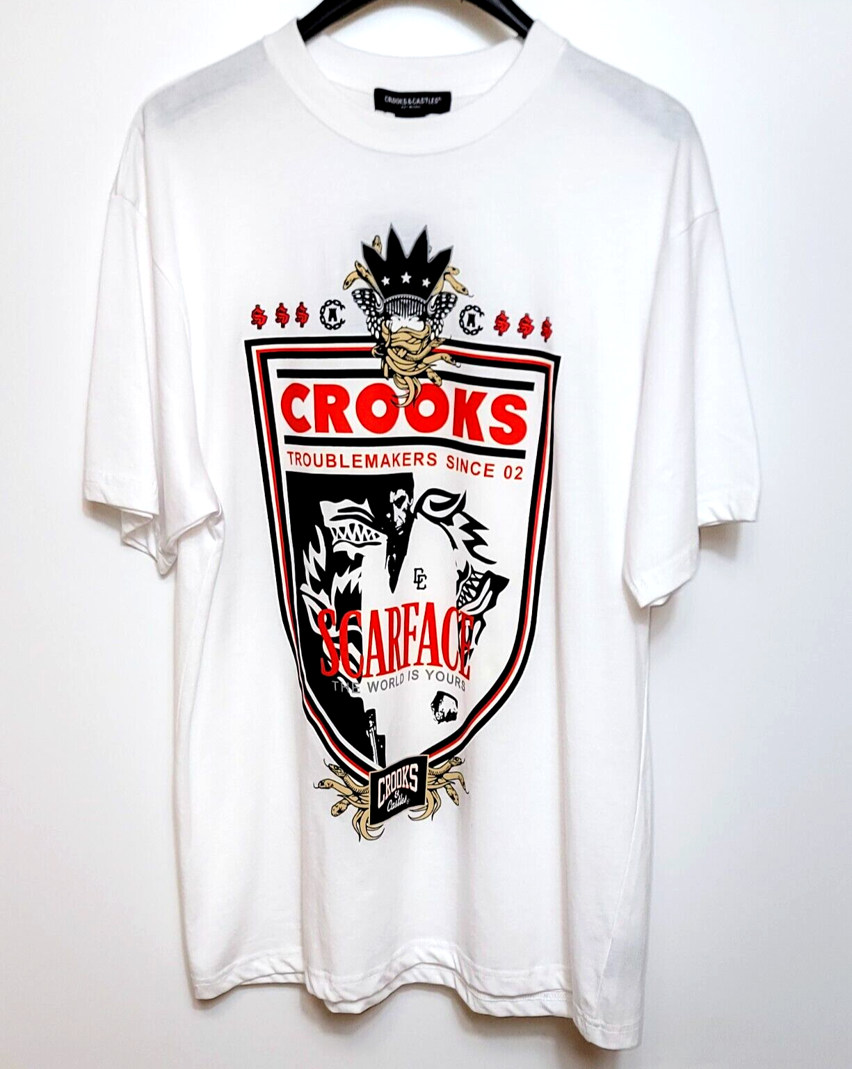 *** New With Tags Dead Stock. Never tried On. 100% Authentic!! Rare Sold Out. Original C&C Website Release - Not a Cheap Copy *** Crooks & Castles Premium T-Shirt Scarface Troublemaker - 100% Authentic T-Shirt Color: White Size: Men's L Length: 31 Inches Shoulder to Helm. Chest: 44 Inches - 22 inches Flat Armpit to Armpit MSRP: $32.00 Product Details Crooks & Castles: Streetwear with a Luxury Aesthetic. The Scarface Troublemaker T-Shirt features an exquisite print of the Crooks Iconic Medusa logo above the Tony Montana - Scarface Insignia. Premium Structure and Stitching Color: Heather Gray Metallic Size: Men's L Length: 31 Inches Shoulder to Helm. Chest: 44Inches - 22 inches Flat Armpit to Armpit MSRP: $32.00 Machine Washable, Hang to Dry ATTENTION: PLEASE READ THE ENTIRE DESCRIPTION AND VIEW ALL PHOTOS BEFORE PROCEEDING WITH THE BUY IT NOW OPTION. Store Policy ** Photos are the exact product in this auction! 100% Authentic. Stored in a Pet Free Environment. Please familiarize yourself with the sizing of Sneakers and Clothing before buying to ensure you are buying the correct size. ** ** Once photographed, all products are sealed into a new polybag and stored in a dust, odor, pet, and smoke free environment ready to be shipped out Any listed pair of sneakers that is over 8 years old may or may not be suitable for wear. Those items should be considered wear at your own risk. *