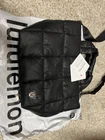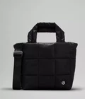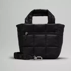This Lululemon Quilted Grid Tote Bag Mini is perfect for any occasion, whether you're traveling, running errands, or working. It features a zip closure and a detachable strap for versatile carrying options. The bag is made of durable nylon with a quilted finish and silver hardware. The strap accent and Lululemon logo add a touch of style. The bag has a lightweight feel and is lined with polyester for added protection. It is a two-tone model and comes in black. The bag is perfect for women who want a stylish and practical accessory. It has a square shape and a crossbody strap handle style. The bag is part of the Lululemon product line and is customized-free. This tote bag is a great addition to any wardrobe and is sure to be a go-to option for any occasion.