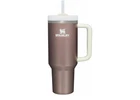 This is a Stanley 40oz Quencher H2.0 Tumbler in Rose Quartz Glow. It is a solid color tumbler made of stainless steel, suitable for hot or cold beverages. The tumbler comes with a drink-through lid and a straw, and it is insulated to keep drinks at the desired temperature. The model is designed for teens, boys, girls, and adults, featuring a pink color theme for a fun and stylish look.