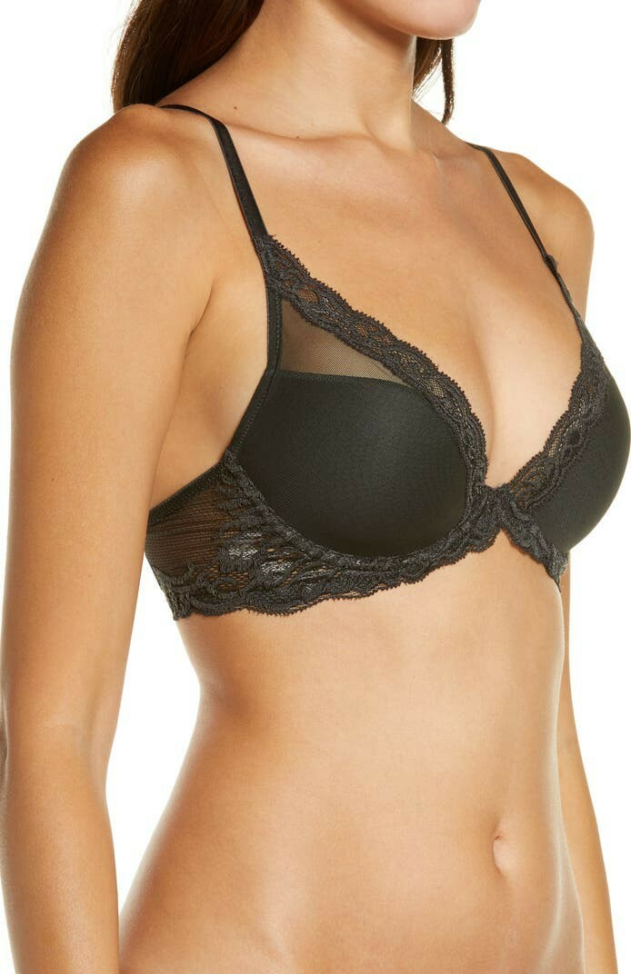 This is for One (1) Natori ® 730023 Feathers Underwire Lace Plunge Contour Bra Size: 34 G (4D's) Dainty lace trims a deeply plunging underwire bra designed with lightly padded cups. Natori's underwire bra features a plunging neckline that goes perfectly with all your low-cut tops and dresses. Sheer feather lace trim adds a sexy touch. This deep plunge bra features beautiful scalloped lace trim along the top and bottom of the cups for pretty appeal. Seamless sides for a smooth look under clothes. Very comfortable, and light as a feather! Style #730023 Deep Plunge Contour Underwire Bra Bra only, bottoms are not included. Contour underwire cups support and shape your breasts. Cups are covered with mesh overlay. Straps are set wide for a sexy, open neckline. Lace with embroidered "feathers" on the sides, back and center panel. Adjustable straps for the perfect fit! Hook-and-eye back closure: 3 columns, 3 rows of hooks Color: COAL (dark grey) US Size: 34 G (DDDD) Cups are measured two ways in lettered sequence OR D's (E=DD, F=DDD, G=DDDD) Original retail price $70.00 "We Ship Our Items In Boxes To Protect The Cups & Underwires" Comes from a Smoke-Free and Pet-Free-Environment. Item will be shipped via USPS. Delivery Confirmation and Tracking are Included. Please contact me with any questions. Stores