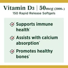 Nature's Bounty Vitamin D, Supports Immune Health & Bone Health, 2000IU Vitamin D3, 150 Softgels Description: IMMUNE SUPPORT: 150-count, 2000IU Vitamin D3 Softgels for immune health.* Vitamin D by Nature’s Bounty may assist the immune system by helping to regulate T and B-lymphocytes.* Vitamin D3 is a more potent form of Vitamin D STRONG, HEALTHY BONES: In addition to immune support, getting a sufficient amount of Vitamin D is critical to building and maintaining strong bones in adults. It is essential for calcium absorption to help support healthy bones.* Nature’s Bounty Vitamin D3 Softgels supplement the Vitamin D your body needs for overall health YEAR-ROUND SUPPORT: Vitamin D3 supplements by Nature’s Bounty contain the same form of Vitamin D that is naturally formed in the body through exposure to sunshine. Nature’s Bounty Vitamin D3 helps replicate the benefits of natural sunshine all year long PURITY IS OUR PRIORITY: Nature’s Bounty is committed to safety and purity in all our supplements. Our rapid release Vitamin D3 Softgels are non-GMO, gluten- and sugar-free, and contain no artificial colors, or sweeteners FROM THE TRUSTED WELLNESS EXPERTS: Nature’s Bounty Vitamin D supplements are a product of 50 years of dedication to quality, consistency and scientific research to make vitamins and nutritional supplements of excellence
