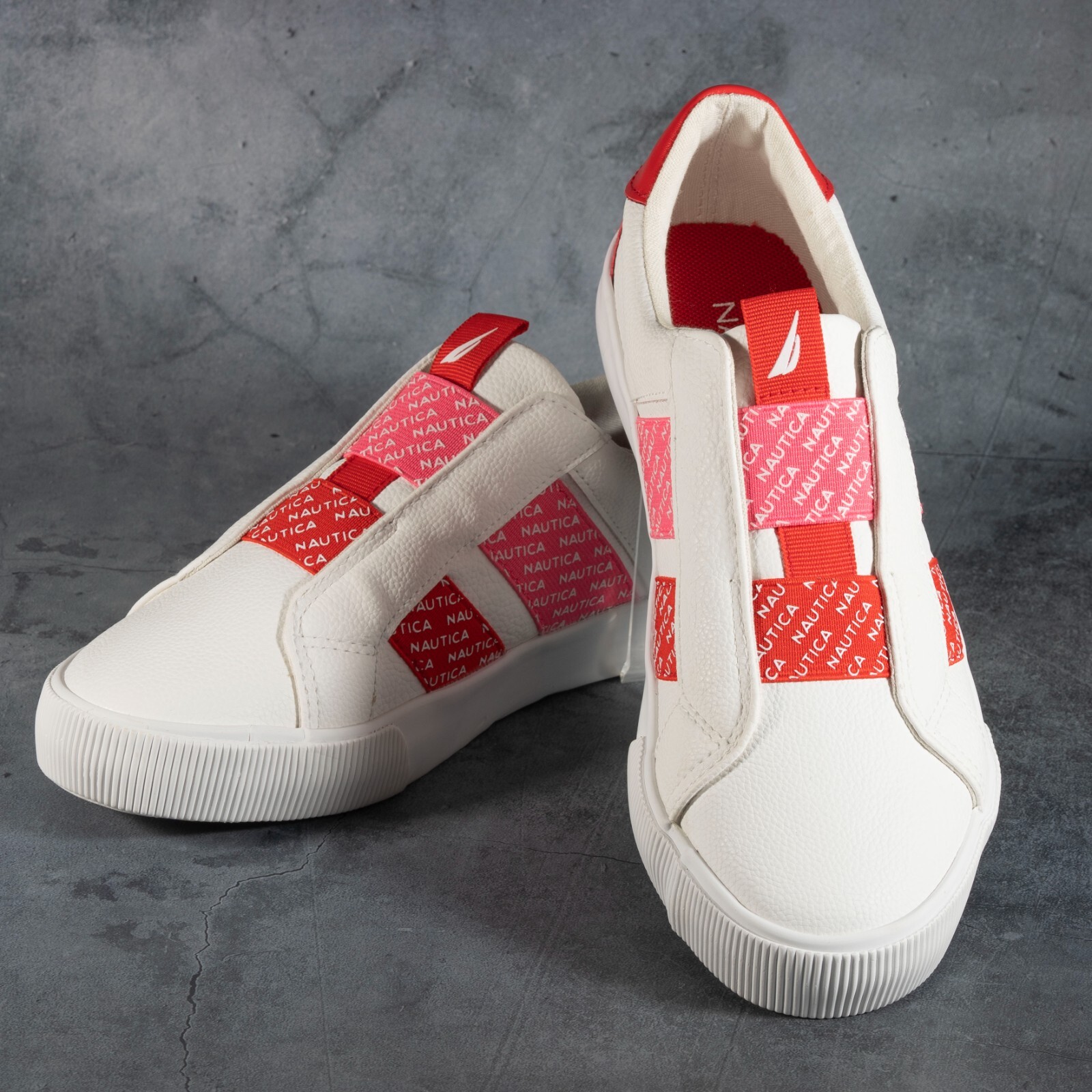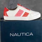The Nautica Women Marita Slip On Fashion Sneakers in White/Red/Pink, size 6, are a stylish and comfortable option for casual wear. These sneakers feature a slip-on closure for easy wear, a solid pattern in colorful tones, and a faux leather upper material. The Náutica Marita model offers a sleek sneaker style with added comfort features, making them a versatile choice for women's footwear.