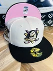 This New Era Prociety Rahnni Mighty Ducks NHL White Hat 7 3/8 in Pink UV Rare Sold Out is a must-have for any sports fan. The hat features an upside-down logo and is made of 100% polyester fabric, making it durable and comfortable to wear. It is perfect for any occasion, whether it's a game or a casual day out. The hat is designed with a solid pattern and is available in a classic white color. It is a men's accessory and is ideal for those who want to showcase their love for the Mighty Ducks. This hat is exclusive, rare, and sold out, making it a perfect addition to any collection.