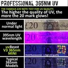 New V3 365nm Mini - Black Light UV Flashlight – High Definition Pure Ultraviolet - Professional Grade High Power Upgraded 5 Core UV LED – USA Stock Product Details Special Feature: Does NOT dim after a few mins of use like typical 365nm UV lights, Rechargeable, Low contamination UV output (more useable 365nm UV for superior results), Upgraded [Oct2023 Ed.]: More UV 365nm power, Wider UV beam, Longer working time, Accidental operation protection {ATTN: Double-click to turn ON] See more Color: Anodized Black Power Source: Battery Powered Light Source Type: UV LED 365nm Material: Aluminum Product Dimensions : 2.02 x 0.64 x 0.64 inches; 3.17 ounces Item model number : uvB-V3-365-MINI Batteries : 1 Lithium Ion batteries required. (included) Date First Available : June 18, 2020 Manufacturer : uvBeast Customer Reviews: 4.3 4.3 out of 5 stars 2,763 ratings Special Feature: Does NOT dim after a few mins of use like typical 365nm UV lights, Rechargeable, Low contamination UV output (more useable 365nm UV for superior results), Upgraded [Oct2023 Ed.]: More UV 365nm power, Wider UV beam, Longer working time, Accidental operation protection {ATTN: Double-click to turn ON] Color: Anodized Black Power Source: Battery Powered Light Source Type: UV LED 365nm Material: Aluminum Included Components: Accessories Product Dimensions: 2.02"D x 0.64"W x 0.64"H Voltage: 3.7 Volts Battery Cell Composition: Lithium Ion Item Weight: 90 Grams Number of Batteries: 1 Lithium Ion batteries required. (included) Water Resistance Level: Water Resistant Warranty Type: 1 year manufacturer Brand: uvBeast Battery Description: Lithium-Ion Runtime: 5 hours Style: technical Bulb Base: GU5.3 Finish Type: Anodized Aluminum Recommended Uses For Product: Outdoor Manufacturer: uvBeast Size: Portable Handheld UPC: 633632141133 Part Number: uvB-V3-365-MINI Item Weight: 3.17 ounces Item model number: uvB-V3-365-MINI Batteries: 1 Lithium Ion batteries required. (included) Finish types: Anodized Aluminum Specific Uses: Fit for Professional and Commercial Use Special Features: Does NOT dim after a few mins of use like typical 365nm UV lights, Rechargeable, Low contamination UV output (more useable 365nm UV for superior results), Upgraded [Oct2023 Ed.]: More UV 365nm power, Wider UV beam, Longer working time, Accidental operation protection {ATTN: Double-click to turn ON] Switch Style: Silicon Rubber Batteries Included?: Yes Batteries Required?: Yes Date First Available: June 18, 2020 Attention: Double click to turn ON. Switch is not faulty. WHY V3 365nm MINI? Aimed at those who need a smaller more portable device but still want uvBeast UV power. Using a UV LED from the larger and renowned uvBeast V3 365nm model, the MINI is a smaller, lighter, convenient package which slips into your pocket but still packs a hefty UV punch! Upgraded features [Oct2023 Ed.]: More UV 365nm power, Wider UV beam, Longer working time, Accidental operation protection UV On A Different Level Entirely. Same high octane yet low contamination uvBeast UV as the V3 365nm. The viewing quality will really impress you. Filtered 365nm UV is considered as the gold standard sweet spot for UV users. uvBeast optimized 365nm UV is in a different league, with little visible light leak, which is exactly what you want in a UV light No More Hassle. At last, no-faff charging! Relief. Simply connect the cable to charge. Thats it. Unscrew nothing, remove nothing. No more hunting around for now-where-did-I-put-that-charger, or, turn back-I-forgot-the-charger User-Centered Design. Our R and D people are not sleeping. We talk when we must and shut up and listen to feedback when we need to. We're always moving with innovation and new product developments. This time we enter the fray with size, portability, and convenience with as much optical uvBeast power we can muster. With user generated wish lists and rigorous user testing, youre getting a proven and field tested product and avoiding a dud which nobody likes A Convenient Little Package. And its ready out-of-the-box. Its our uvBeast UV power, and newest UV tech which were known for, which combines small size with a big UV payload that youre looking for. High power UV means better results for you Attention: Double click to turn ON. Switch is not faulty. Prevents accidental operation in your pocket