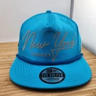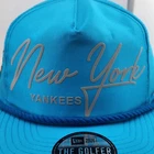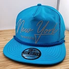 This New York Yankees Golfer Hat is a rare find for any fan of the team. Made by New Era, this metallic nylon cap with a rope snapback is perfect for any occasion, whether it's a wedding, party, golf tournament, or just a casual day out. The hat is adjustable and comes in a solid blue color, with the golfer style and sports theme making it a great addition to any streetwear or MLB baseball outfit. The hat is made in Bangladesh and is not vintage.