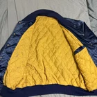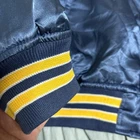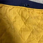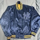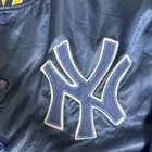 New York Yankees Stadium Jacket Navy Yellow Striped Rib, Embroidered Logo, Mens Features Specifications New York Yankees Stadium Jacket - Navy Yellow Striped Rib, Embroidered Logo, Men's Brand Name: New York Yankees Product Type: Jacket Color: Navy Material: Nylon Other Features: Embroidered Yankees logo, Yellow and Navy striped rib, Snap button closure This stylish New York Yankees Stadium Jacket is a must-have for any fan. Made from lightweight nylon, it features a striking navy color with eye-catching yellow and navy striped ribbing. The embroidered Yankees logo adds a touch of authenticity and flair. Designed for comfort and ease of movement, this jacket is perfect for casual outfits. The snap button closure allows for easy wear and removal. Please note that there is some paint chipping and a tear in the right inner quilting, but the exterior remains in good condition. This jacket is a vintage piece, making it a unique addition to your collection.