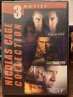 Nearly nine hours of Nicolas Cage! Prisoners of the Ghostland Languishing in the lockup of the garish Samurai Town, career criminal Hero (Nicolas Cage) has a shot at a pardon from The Governor (Bill Mosely) if he can invade neighboring, nuked-out Ghostland and rescue precious, abducted sex worker Bernice (Sofia Boutella). To make sure he stays on mission, our protagonist is fitted out with an explosives-laden suit that'll blow if he deviates. Expectedly out-there English language bow for director Sion Sono co-stars Nick Cassavetes, Tak Sakaguchi. 100 min. Widescreen; Soundtrack: English. Willy's Wonderland With his car broken down in the Nevada desert, a quiet drifter (Nicolas Cage) didn't have any options for cash past an after-hours janitorial job at a condemned family entertainment center. Unfortunately for him and a gaggle of trespassing teens, the facility's eight animatronic mascots came to murderous life-and it doesn't look like they'll win enough tickets to see the morning. Outrageous horror-comedy actioner also stars Emily Tosta, Beth Grant, Ric Reitz, Grant Cramer. 82 min. Widescreen; Soundtrack: English. Face/Off At his best, director John Woo turns action movies into ballets of blood and bullets grounded in character drama. Face/Off marks Woo's first American film to reach the pitched level of his best Hong Kong work (Hard-Boiled). He takes a patently absurd premise--hero and villain exchange identities by literally swapping faces in science-fiction plastic surgery--and creates a double-barreled revenge film driven by the split psyches of its newly redefined characters. FBI agent Sean Archer (John Travolta) must play the villain to move through the underworld while psychotic terrorist Castor Troy (Nicolas Cage) becomes a perversely paternal family man while using every tool at his disposal to destroy his nemesis. Travolta vamps Cage's tics and flamboyant excess with the grace of a dancer after his transformation from cop to criminal, while Cage plays the sullen, bottled-up agent excruciatingly trapped behind the face of the man who killed his son. His attempts to live up to the terrorist's reputation become cathartic explosions of violence that both thrill and terrify him. This is merely icing on the cake for action fans, the dramatic backbone for some of the most visceral action thrills ever. Woo fills the screen with one show-stopping set piece after another, bringing a poetic grace to the action freakout with sweeping camerawork and sophisticated editing. This marriage of melodrama and mayhem ups the ante from cops-and-robbers clichés to a conflict of near-mythic levels. Snake Eyes Set in Atlantic City, an assassination attempt thrusts a detective (Nicolas Cage) into a murder case with 14,000 potential suspects and a deadly conspiracy where nothing is what it appears to be. (English), Set in Atlantic City, an assassination attempt thrusts a detective (Nicolas Cage) into a murder case with 14,000 potential suspects and a deadly conspiracy where nothing is what it appears to be. Next Las Vegas showroom magician Cris Johnson has a secret which is a gift and a curse which torments him: he can see a few minutes into the future. Sick of the examinations he underwent as a child and the interest of the government and medical establishment in his power, he lies low under an assumed name in Vegas, performing cheap tricks and living off small-time gambling 'winnings.' But when a terrorist group threatens to detonate a nuclear device in Los Angeles, government agent Callie Ferris must use all her wiles to capture Cris and convince him to help her stop the cataclysm.