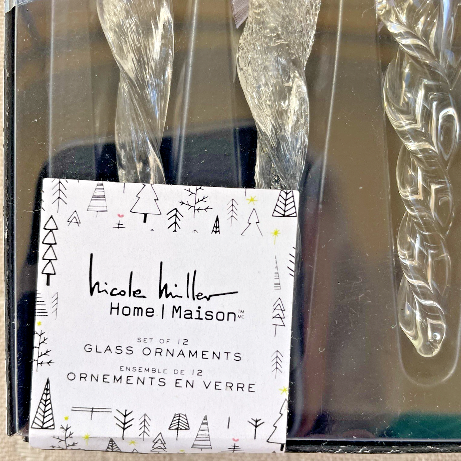 Nicole Miller Home | Maison – Set of 12 Glass Icicle Ornaments Elegant set of 12 clear glass icicle ornaments featuring mixed textures and shapes for a refined, icy look. Each ornament includes a white hanging ribbon and is housed in the original presentation box. Perfect for modern or classic holiday décor, gifting, or designer Christmas displays.