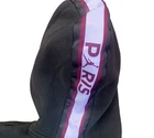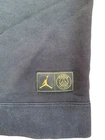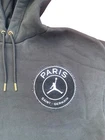 Elevate your streetwear game with this Nike Air Jordan Paris Saint Germain Taped Black Hoodie in size Large. The hoodie features a solid pattern with an embroidered logo accent on the front. It has a drawstring closure and a hooded design with pockets for added convenience. The cotton blend material is comfortable and durable, making it perfect for gym and training, soccer, casual wear, and basketball. This pullover style hoodie is a must-have for any Jordan fan and a great addition to your activewear collection. Measurements: Pit to pit length: 23” Top of collar to bottom length: 27” Top of shoulder to cuff length: 24” Shoulder to shoulder length: 25”
