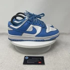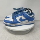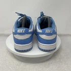 The Nike Dunk Low UNC University Blue Shoes are unisex sneakers featuring a low-top design in a solid blue color with the iconic Nike logo accents. These athletic shoes have a lace-up closure and are crafted with leather uppers and fabric lining for comfort. They are designed for various activities such as boxing, CrossFit, and basketball, offering arch support, cushioning, and a rubber outsole for enhanced performance. The sneakers are part of the Nike Dunk product line and have a stylish university theme, making them a colorful and versatile choice for both men and women. MENS 6.5 / WOMENS 8