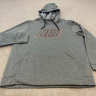 Pattern: Heathered Closure: Drawstring Brand: Nike Accents: Logo Fit: Regular Vintage: No Department: Men Theme: Classic, Sports Size Type: Regular Type: Hoodie Features: All Seasons, Hooded, Pockets Graphic Print: Yes Material: Polyester Product Line: Nike Sportswear Style: Pullover Sleeve Length: Long Sleeve Fabric Type: Fleece Size: XL Neckline: High Neck Color: Gray Country/Region of Manufacture: Vietnam