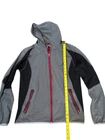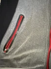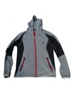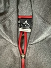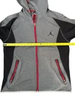 This Nike Jordan hoodie is a men's size L in gray with black and red accents. It features a full zip closure, DRI-Fit polyester material in a knit fabric type. The hoodie has a logo accent, hooded style, and pockets. It is machine washable and part of the Nike Jordan product line, made in Thailand.