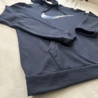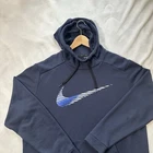 This Nike Men's Dri Fit Hoodie in size XL features a striking big center Swoosh graphic print in blue, giving it a classic and athletic style. The hoodie has long sleeves with a drawstring closure and is made from fleece fabric, making it cozy and comfortable for activities like gym training and running. It also includes a hood and pockets for added functionality. This pullover hoodie from the Nike Sportswear line is machine washable and suitable for regular wear.