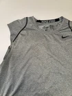 This Nike Pro Dri Fit Sleeveless Shirt Tank Top in Gray, Size Large is perfect for any athletic activity. The lightweight and breathable material made of polyester ensures maximum comfort during gym & training, cross training, running & jogging. The tank top features a solid pattern, crew neck. The Nike brand is known for its quality and this tank top is no exception. The athletic fit is perfect for any male looking for a comfortable and stylish activewear top. The shirt is part of the Nike Pro product line, known for its high-quality activewear.