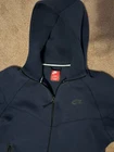 Elevate your activewear game with this Nike Sportswear Tech Full-Zip Hoodie in blue. Designed with a solid pattern, long sleeves, and a high neckline, this hoodie is perfect for gym and training sessions during the winter season. Made with a cotton blend knit fabric from Cambodia, it features a full zip closure and pockets for convenient storage. The athletic fit and zipper accents make it a stylish addition to any sportswear collection. This hoodie is available in size medium tall and is part of the Nike Sportswear product line.