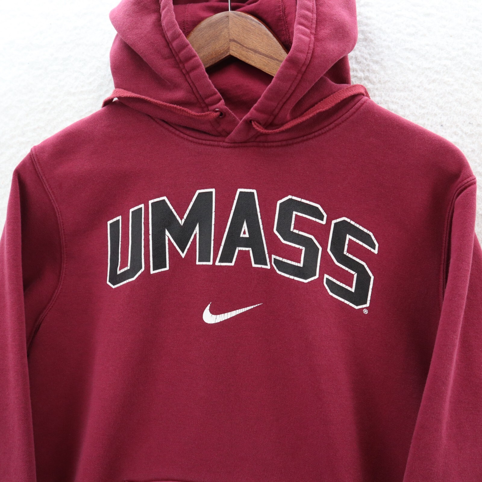 Nike UMass Hoodie Men's Medium Red Center Swoosh Sweatshirt University Sports This item is in pre-owned condition and therefore may show signs of previous use, such as small stains, holes, or other wear. Please view all of the items photos as any defects will be documented there. Measurements can be seen in the photos.