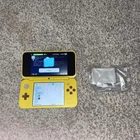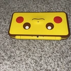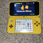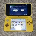 The product is a Nintendo 2DS XL handheld system in Pikachu Edition Yellow color. It has 128 GB storage capacity and comes with 100+ games pre-installed on a 128GB SD card. The system features Wi-Fi capability, internet browsing, and includes a stylus. It is suitable for use in the NTSC-U/C region (US/Canada) and is branded as Nintendo.