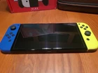 Nintendo Switch Oled Bundle The Console: Includes an OLED model switch, the dock, the power adapter, an HDMI cord, a joycon grip, joycon straps, and a set of joycons. Everything is in good condition. There is some residue on the back of the switch from a sticker I used to have on there. The screen has no scratches that I'm able to see. Includes the original box, but not the interior packaging. There is a 128 GB micro SD already installed. ***THIS DOES NOT INCLUDE THE ORIGINAL WHITE JOYCONS, ONLY THE BLUE/YELLOW ONES SHOWN*** Accessories: The console has a glass screen protector already installed. An Atrix carrying case is included. It also includes a charging station that can hold 4 joycons or 2 pro controllers. Games: Includes Minecraft, Terraria, and Animal Crossing New Horizons. This was my personal console; I did my best to keep it clean and in good condition. It has already been factory reset and may need to be updated on startup. Everything will be packaged with the utmost care. Feel free to reach out with any questions or concerns! Open to offers!