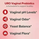 Four Lactobacillus strains are present in URO Vaginal Probiotic, together with XOS prebiotics to support the cultures' continued viability. With the aid of these probiotics, vaginal comfort, healthy odor, and pH balance can all be enhanced. The microbiome of the vagina is naturally diverse. The vagina's pH may become overly basic and more open to dangerous bacteria if there are insufficient Lactobacillus probiotics. This could cause discomfort and an unpleasant odor. 1) Science-backed ingredients to support healthy: Vaginal pH* Vaginal Odor* Yeast Balance* Vaginal Flora* 2) Recommended Usage Take 2 URO capsules once daily, with water. Keep your bottle in a cool, dry place. Consistency is key— URO is fully effective about 8 weeks in. 3) Vaginal Probiotic Ingredient Facts Serving Size: 2 capsules, 30 servings per container. V-Positiv Probiotic Blend™: Lactobacillus acidophilus, Lactobacillus rhamnosus, Lactobacillus reuteri, Lactobacillus fermentum 50 mg (5 Billion CFUs), Xylooligosaccharides (XOS) 400 mg Other Ingredients: Maltodextrin, Cellulose (Vegetarian Capsule), Natural Color