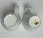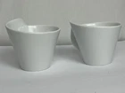 Vintage Y2K coffee cups from the Museo Moderno Buenos Aries in Argentina. Set of two matching Museum of Modern Art cups made by OKKO - the manufacturers of premium Turkish coffee machines. Modern lively wave design in a minimalist solid white ceramic porcelain enhances the invigorating effect if smooth mocha lattes and strong espresso. Enhance your coffee set with a statement mod design perfect for collectors or for a self-care latte, coffee, or tea. Purchased in 2004 at the MOMA Buenos Aires gift shop and only displayed with no chips, cracks, or stains - minor base wear with original price tag.Max height 4" x 4.5"d. Lot contains a single two piece set of coffee cups.