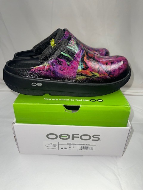 The OOFOS OOOClog Limited Neon Rose Clogs in women's size 10 are a stylish and comfortable choice for casual occasions. These slip-on clogs feature a floral pattern in a vibrant multicolor design, with a round toe and standard shoe width for a comfortable fit. Made with synthetic materials, these clogs have a flat heel style and are perfect for everyday wear. The OOFOS brand is known for its quality and support, making these clogs a reliable choice for women looking for both style and comfort in their footwear. Please see all photos for proof of new condition (foam inserts included) and box. Feel free to message us any questions you may have on this item! All purchases benefit De Pere Christian Outreach Thrift Store, De Pere, Wisconsin. All of our products were donated by generous people in our community (which may explain prices lower than you'd expect).