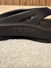 Explore the blend of comfort and style with these OOFOS unisex black flip flops, perfect for both casual wear and athleisure activities. Designed with a sleek rubber upper and a versatile black hue, these sandals easily transition from a day at the beach to a bike ride around town. Offering a low heel height for all-day wearability, these size 6 men (size 8 women, EU 39) sandals boast a durable construction made for the young and young at heart. Whether it's a laid-back day or a casual outing, these OOFOS flip flops deliver on both comfort and style.