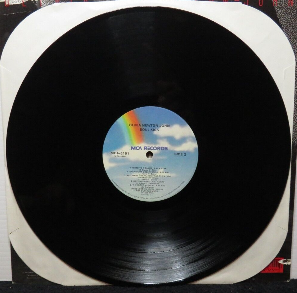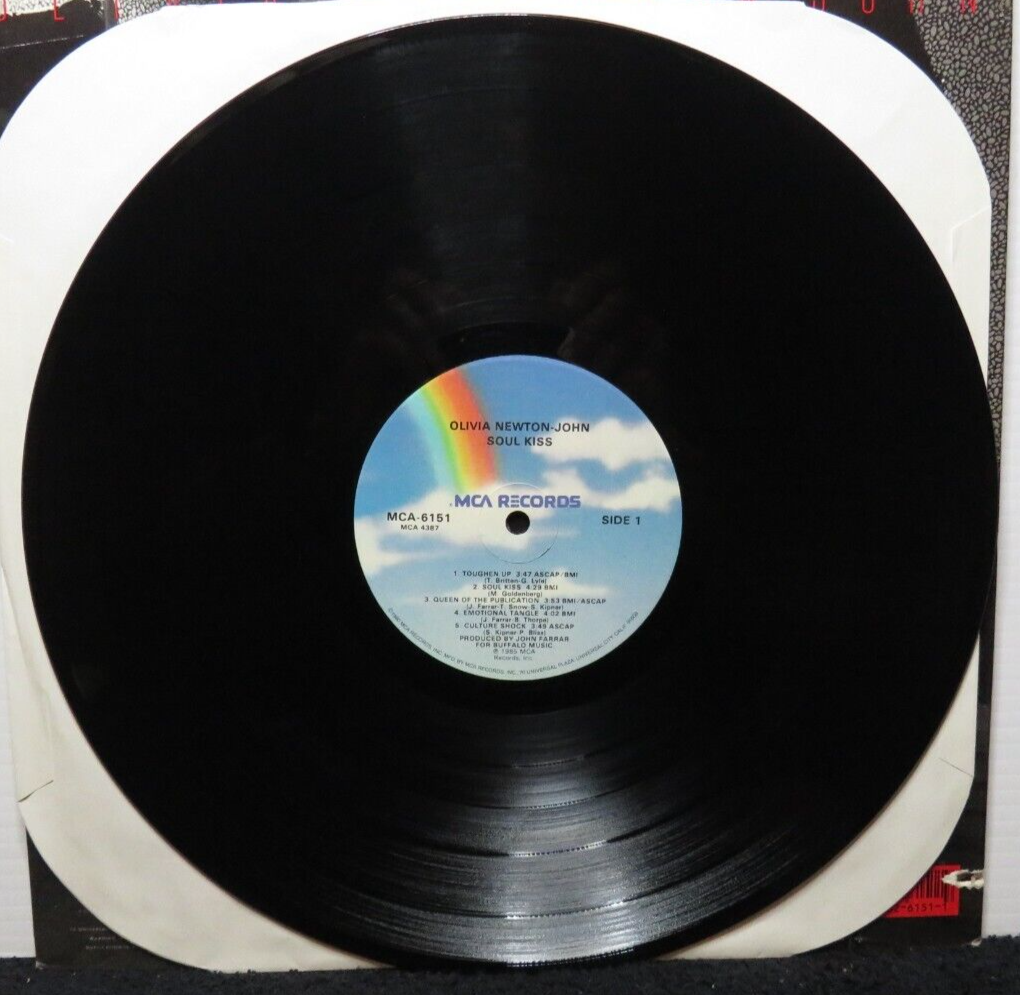 YOU ARE BIDDING ON A OLIVIA NEWTON JOHN SOUL KISS (VG+) MCA-6151 LP VINYL RECORD RECORDS ARE IN VERY GOOD USED CONDITION UNLESS NOTED COVERS USUALLY HAVE WEAR AND ARE NOT GRADED PLEASE VIEW ALL PHOTOS FOR THE BEST DESCRIPTION I WILL COMBINE SHIPPING ON RECORDS BOUGHT IN THE SAME 5 DAY PERIOD EACH ADDITIONAL RECORD IS 50 CENTS MORE PLEASE REQUEST TOTAL BEFORE PAYING TO GET DISCOUNT I USE RECORD MAILERS WITH CARDBOARD BACKERS HERE IS THE GRADING THAT I USE FOR REFERENCE TO MY VISUAL INSPECTION IF THERE IS A PROBLEM PLEASE LET ME KNOW I STRIVE FOR 5 STAR FEEDBACK Near Mint (NM or M-) A nearly perfect record. Many dealers won't give a grade higher than this implying (perhaps correctly)that no record is ever truly perfect. The record should show no obvious signs of wear. A 45 RPM or EP sleeve should have no more than the most minor defects, such as almost invisible ring wear or other signs of slight handling. Basically, an LP in near mint condition looks as if you just got it home from a new record store and removed the shrink wrap. Near Mint is the highest price listed in all Goldmine price guides. Anything that exceeds this grade, in the opinion of both buyer and seller, is worth significantly more than the highest Goldmine book value. Very Good Plus (VG+) A Very Good Plus record will show some signs that it was played and otherwise handled by a previous owner who took good care of it. Record surfaces may show some signs of wear and may have slight scuffs or very light scratches that don't affect one's listening experiences. Slight warps that do not affect the sound are "OK". The label may have some ring wear or discoloration, but it should be barely noticeable. The center hole will not have been misshapen by repeated play. In general, if not for a couple things wrong with it, this would be Near Mint. All but the most mint-crazy collectors will find a Very Good Plus record highly acceptable. Very Good (VG) Many of the defects found in a VG+ record will be more pronounced in a VG disc. Surface noise will be evident upon playing, especially in soft passages and during a song's intro and fade, but will not overpower the music otherwise. Groove wear will start to be noticeable, as with light scratches (deep enough to feel with a fingernail) that will affect the sound. Labels may be marred by writing, or have tape or stickers (or their residue) attached. Good (G), Good Plus (G+) Good does not mean Bad! A record in Good or Good Plus condition can be put onto a turntable and will play through without skipping. But it will have significant surface noise and scratches and visible groove wear (on a styrene record, the groove will be starting to turn white).