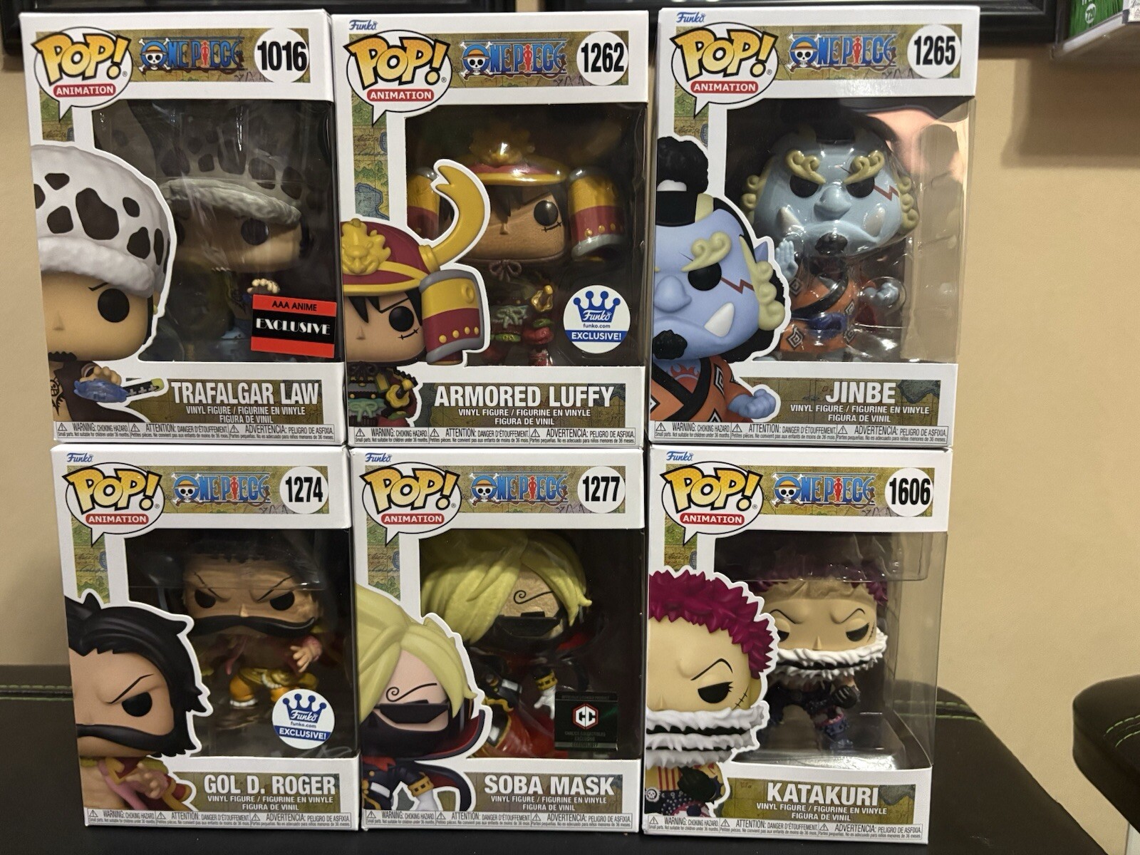 Funko Pop Once Piece Set of 6 of new box figuresThey are all brand new and the boxes are in excellent condition.Shipped in well protected individual boxes and bubble wrap. The Set includes the following:1016 Trafalgar Law1292 Armored Luffy1265 Jinbe1274 Gol D. Roger1277 Soba Mask1606 KatakuriFree Shipping Offered, Outside of US will have a shipping feeALL SALES FINAL #funko #funkopop #onepiece #anime #luffy