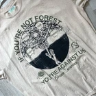 Online Ceramics Forest Against Tshirt in the color beige. Short sleeves. Screen-printed graphics with front saying "If you're not forest /you're against us / online ceramics". Crew neck. Regular fit. Size xlarge, mens. In good pre-worn condition, just some minor wash wear/pilling. 100% cotton. Made in usa. Perfect casual, streetwear, everyday tee. //9.8
