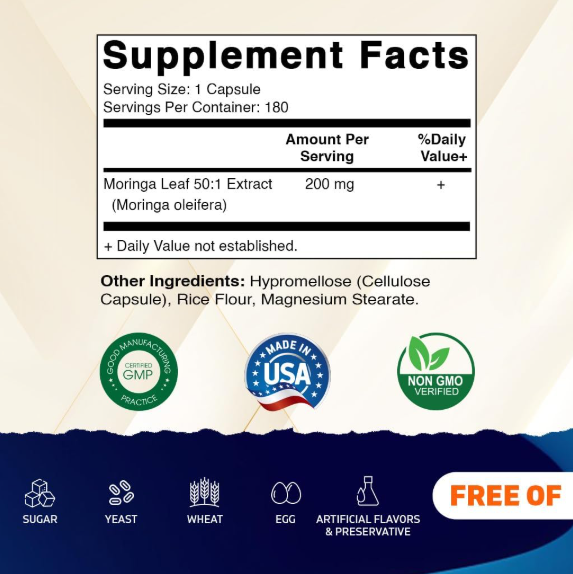 Organic Moringa Capsules, Moringa Powder Capsules Support Energy & Healthy Gut, US Warehouse - FREE & FAST Shipping in US Product Description: These statements have not been evaluated by the FDA. This product is not intended to diagnose, treat, cure, or prevent any disease or health condition. Extra Strength - Our capsules are made with moringa leaf 50:1 extract. High-Quality Ingredients: Non-GMO, Gluten-Free, and vegetarian capsules for easy digestion. Comprehensive Formula: Powerful antioxidants that promote overall health, promotes cardiovascular & energy health* Convenient Dosage: 180 capsules per bottle for a long-lasting supply. Trusted Brand: Manufactured in the USA following strict GMP guidelines for quality assurance Feedback: 1.Any question for your order, please contact us in time, we will reply to you within 24 hours and give you a satisfactory answer. 2.If you are satisfied with our products and services, hope to take up your a little precious time to leave feedback reviews for our products.Thanks! 3.Your satisfaction is our effort. Welcome to order again! Have a great day! Our Policy: 100% Satisfaction Guarantee 20% of restocking fee will be charged for return item