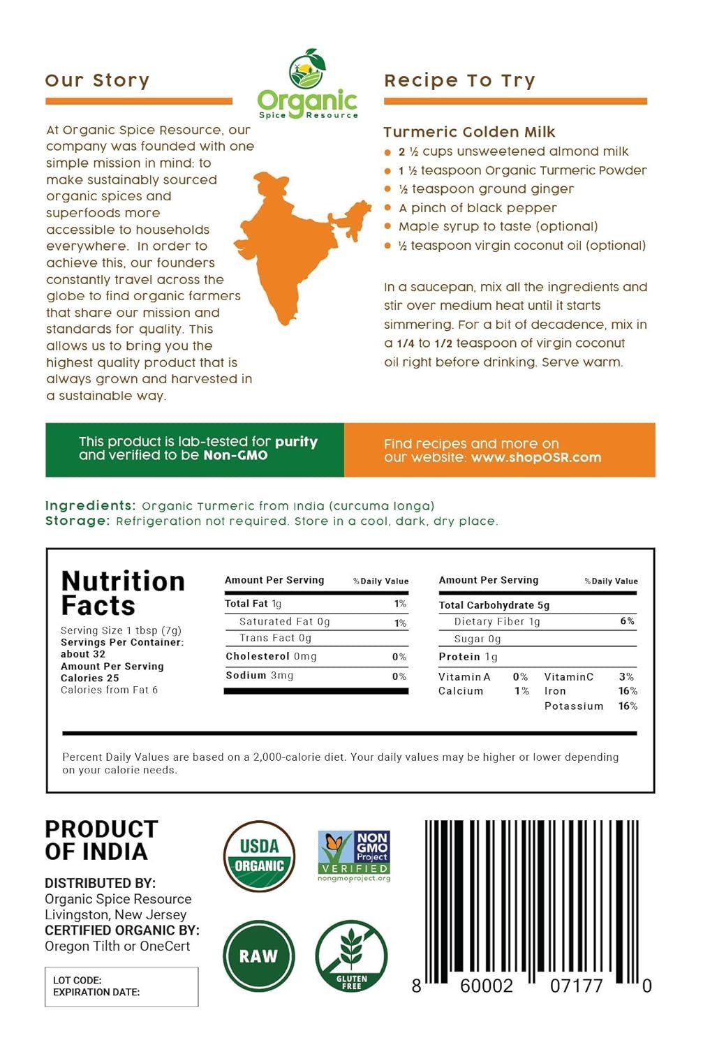Organic Spice Resource Turmeric Root Powder, 8 oz (226 g) 8 Ounce (Pack of 1) Product Details Product Dimensions : 7 x 5 x 2 inches; 8 ounces UPC : 860002071770 Manufacturer : Organic Spice Resource Country of Origin : India Units : 8.0 Ounce Brand: Organic Spice Resource Item Form: Powder Manufacturer: Organic Spice Resource Item Package Quantity: 1 Package Information: Bag PREMIUM USDA ORGANIC Turmeric POWDER (Curcumin Longa) - Our Gluten Free Organic Turmeric Root Powder is packed in a resealable kraft bag to maintain freshness! HIGH CURCUMIN CONTENT - Our Turmeric Powder is tested to have a minimum of 3% of Curcumin. PURITY - No Colors, NO Additives, No Preservatives, and NO ETO Treatment. CERTIFIED USDA ORGANIC / GLUTEN FREE and NON-GMO - The product is batch-tested and verified not only to be USDA Organic but also Gluten Free and Non-GMO OUR PROMISE - We promise you will love our Organic Turmeric Powder and if you are not simply contact our staff with your order information and we will issue you a full refund! No questions asked.