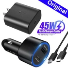 Interface : 45w usb type C + 15w usb type A Input : 12-24V Output : PDO : 5V3A / 9V3A / 15V3A / 20V2.25A PPS : 3.3-20V 2.25A (7.5-45W) USB-A : 5V2A / 9V1.67A Cable : USB-C to USB-C Interface Car charger can charge two devices at the same time . Support PD3.0/QC3.0/QC2.0/AFC/FCP . Port 1 : 45WType-C connector . Support PD3.0/Q Super Fast Port 2: 15W USB connector . Support PD3.0/Q Super Fast Build: METAL&ABS MATERIAL SAFE SECURITY: The solid full Aluminum Alloy body features exquisite texture and durable lifetime, and protects your devices from over-heating, over-voltage, over-current. Package includes: 1 x 45W Dual Port Car Charger Or 1 x 45W Wall Charger Or 3ft/6ft Cable