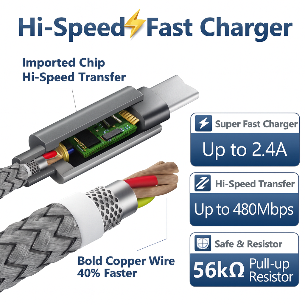Premium USB-A to USB-C Fast Charging Cable – Durable Braided Nylon – High-Speed Data & Power Upgrade your everyday charging experience with this Premium USB-A to USB-C Cable , engineered for durability, speed, and reliability. Featuring a strong braided nylon exterior and reinforced metal connectors , this cable is designed to withstand daily wear while delivering fast, stable performance for all your USB-C devices. Key Features: ✔ Fast Charging & Stable Power Delivery Supports fast charging for compatible smartphones, tablets, and other USB-C devices—ensuring efficient, reliable power every time. ✔ High-Speed Data Transfer Transfer photos, videos, and files quickly with high-performance data syncing. ✔ Durable Braided Nylon Design The premium braided outer layer prevents tangling and provides long-lasting strength, even with heavy daily use. ✔ Reinforced Metal Connectors Aluminum alloy connectors offer a secure, stable connection and enhanced resistance to bending or breakage. ✔ Universal Compatibility Works with all USB-C devices, including: Android Smartphones Tablets & iPads with USB-C Power Banks USB-C Headphones & Accessories Laptops with USB-C ports ✔ Safe & Reliable Performance Built-in smart chip ensures stable current, preventing overheating and protecting your devices. Why Choose This Cable? Whether for everyday charging, fast data transfer, or a reliable backup cable, this premium USB-A to USB-C cord delivers strength, performance, and long-term value .