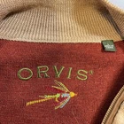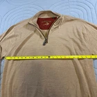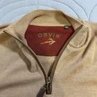 The Orvis men's large brown sweater is made of 100% Merino wool, making it a high-quality and warm garment perfect for outdoor activities like camping and hiking. This quarter-zip sweater features a tight-knit design with a mock neck neckline and long sleeves, ideal for keeping you comfortable during various seasons. The classic solid brown color and subtle logo accents add a touch of style to this versatile pullover, which is both machine washable and easy to care for. Perfect for casual or travel occasions, this Orvis sweater is a must-have for any nature lover or outdoor enthusiast.