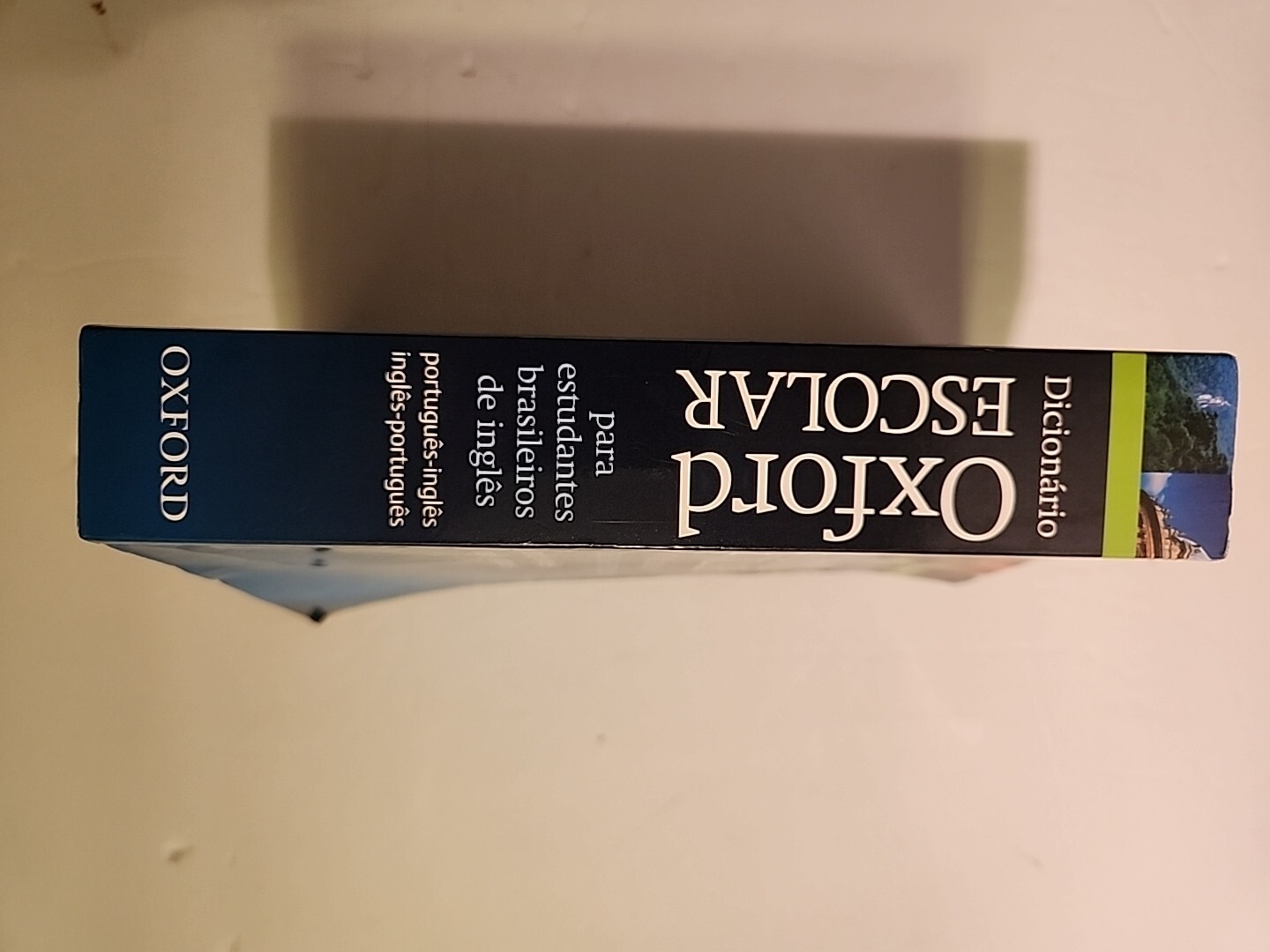 The product is the "Dicionario Oxford Escolar para estudantes brasileiros de ingles," a 2019 edition dictionary for young adults and adults, translating from Portuguese to English. It is part of the Oxford dictionary series and features English-language content. The book is in paperback format and authored by A. S. Hornby. This is a good condition paperback it does have some shelf wear scratches and scrapes bending and wrinkles fading and scrapes on cover and pages.