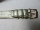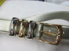This is a used belt in a light moss green-gold blend color?. It measures 1" wide and features a decorative belt buckle with both gold and silver tone twist accents. It does show signs of wear on the inside and a crack next to the twist part. That would be covered with the other end of the belt. 110124 Please write if you have any questions. Please see all of my listings
