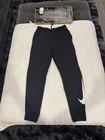 These Nike Dri-FIT jogging pants are perfect for any active occasion, whether you're hitting the gym or going for a run. They are made with 100% polyester and feature a relaxed fit, adjustable waist, and elastic waistband with a 30-inch circumference. The pants also have pockets for convenience and are water-resistant, making them ideal for winter, fall, and spring activities such as cycling, hiking, and running. The pants are easy to care for and can be machine washed. They come in a solid black color with a stripe pattern and feature the Nike logo. These pants are a great addition to any activewear collection and are perfect for anyone who values comfort and functionality.