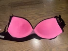This PINK Victoria's Secret Black Script 32DD Wear Everywhere Wireless Push Up Bra is a must-have for any woman's intimate wardrobe. The bra features a solid pattern and a hook & eye closure, with bra straps that provide a comfortable fit all day long. The wireless push up bra is made of a polyester blended fabric and is part of the Victoria's Secret Pink Wear Everywhere product line. The adjustable straps and back closure ensure a perfect fit, while the padded cups provide a push-up effect. This bra is perfect for everyday wear and is a great addition to any wardrobe.