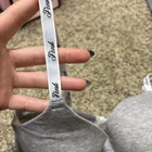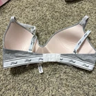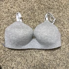 This is a Victoria's Secret Pink Wear Everywhere bra in size 38D. It is a gray T-shirt bra made of a cotton blend material. The bra has a wireless underwire type, hook & eye closure, and adjustable bra straps. It features a back closure, lightly lined cups, and is designed for everyday wear.