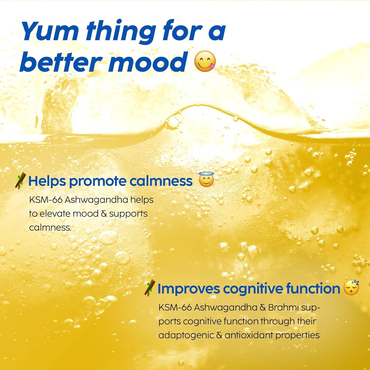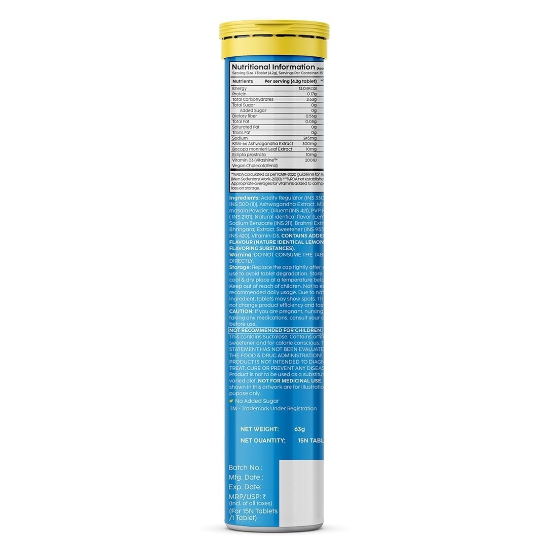 Ingredients: Citric acid (Acidity regulator) [INS 330], Sodium bi-carbonate (Acidity regulator) [INS 500 (ii)], Dextrose anhydrous, Ashwagandha Extract (Withania somnifera), Sorbitol [INS 420 (i), Lemon Flavour, Sodium benzoate (INS 211), Lubrication, PKV-30 (INS 1201), Mango Powder, Black Salt, Cumin Powder, Iodised Salt, Coriander Powder, Red Chilli powder, Celery, Black Pepper, Ginger, Sweetener (INS 955), Brahmi Extract, Bhringraj Extract Directions: Drop one tablet in glass of 150-200 ml of water. Let the tablet completely dissolve and your drink is ready! From the brand Previous page EFFERVESCENTS POWDER Next page Product Description Play Video Ashwagandha High absorption clinically-proven formula that promotes relaxation & helps to relieve emotional stress. Bhringraj Extract Bhringraj is a well-known medicinal herb that has long been utilised in Ayurvedic medications and treatments. Bhrami Extract Brahmi reduces inflammation, balances cortisol, enhances mood, and regulates blood pressure levels, making it a mainstay herb in traditional remedies. Vitamin D3 Vitamin D3 plays a crucial role in the calcium and phosphorus metabolism of our body. It is necessary for strong bones and muscles.