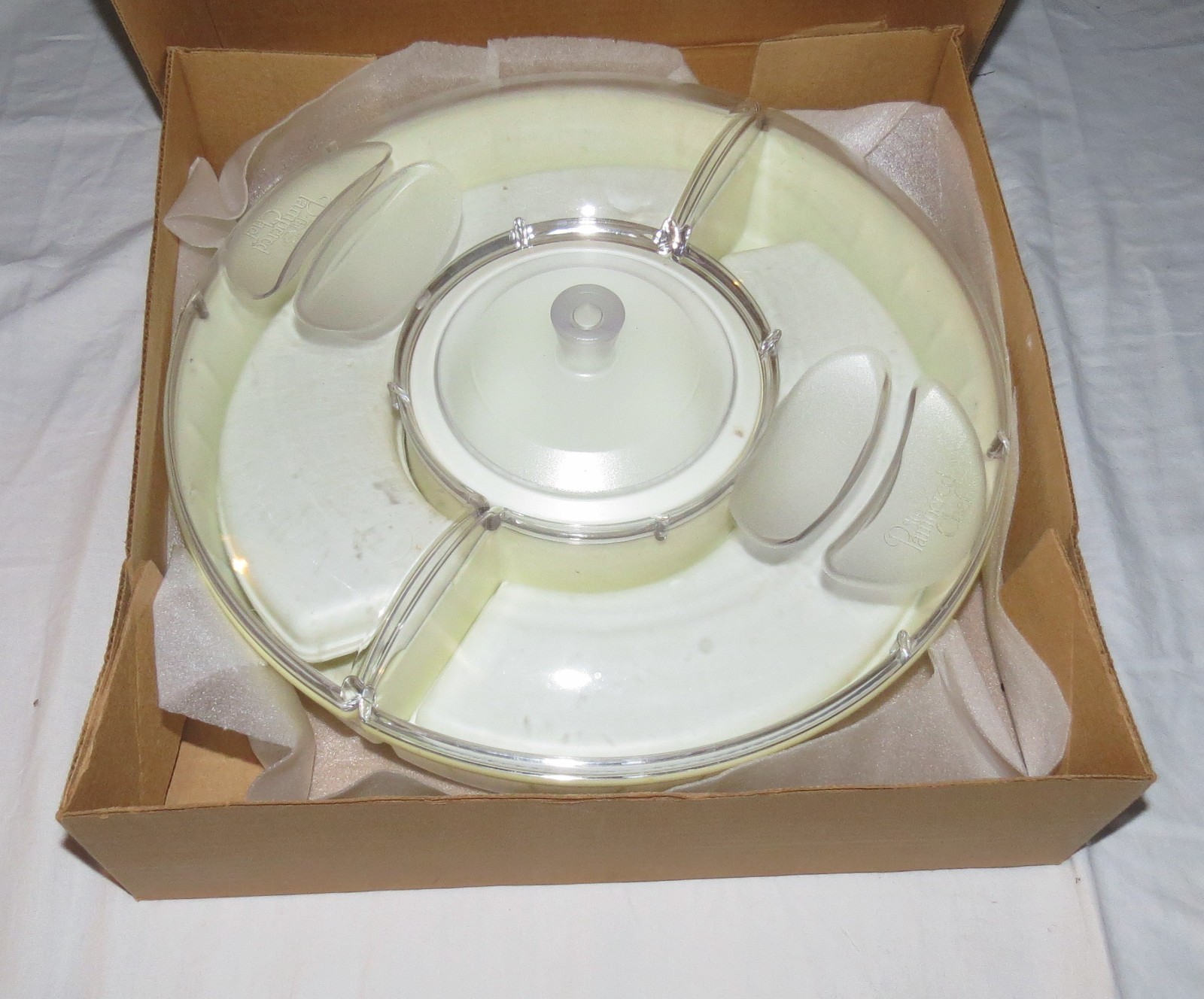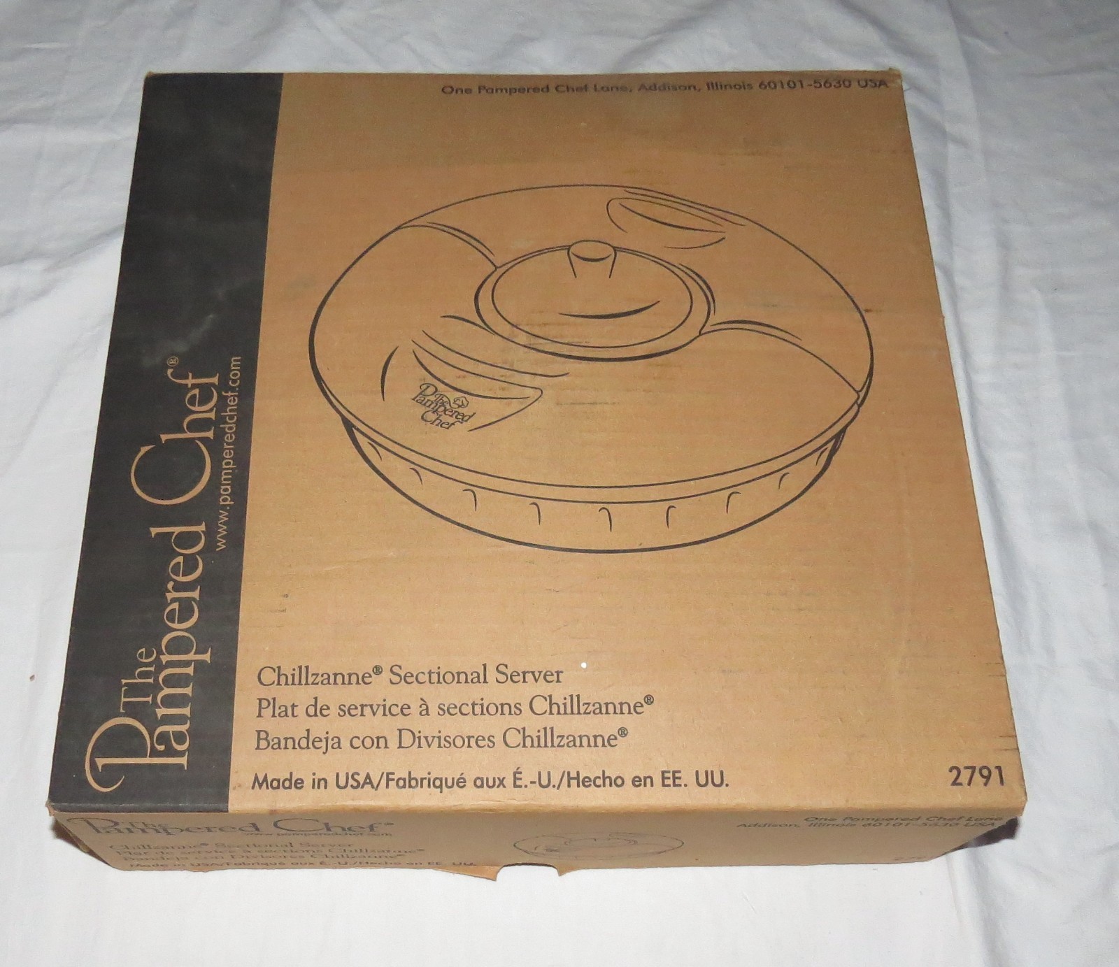 Pampered Chef Chillzanne Sectional Server 2791 - New in Open Box -------------------------------------------------------------------- We try to declare all issues. Any white spots in the pictures that have not been mentioned are more than likely glare from the camera flash, but if you have any doubts, please don't hesitate to ask. Please look at our other auctions, and especially our ebay store items, and save on shipping with multiple wins Please email us with any questions. Honest Shipping : We do not insult your intelligence by hiding the shipping costs in the price of our items, and then offering "free" shipping - trying to fool you into thinking that we are absorbing the shipping costs. What nonsense! Our shipping costs are based on an estimate of the shipper's rates, ebay shipping fees, plus a small handling charge. If you can find the same item with a cheaper total cost - purchase price plus shipping - anywhere on the web - please contact us. We cannot guarantee to beat it (because of distance-based shipping), but will give it our best shot. Please be sure that you understand, and are comfortable with, the total costs before making your purchase. If you have any questions - please ask first. Combined Shipping: We always offer combined shipping for multiple purchases. Please add your purchases to your ebay "cart". When you have completed your purchases, (either multiple items from a single listing, or items from two or more listings), please contact us, using the "Requests total from seller" button, and we will generate a final combined-shipping invoice.. Note: You will possibly receive an earlier invoice (or invoices) generated automatically by ebay. These are accurate for single item purchases, but often inaccurate for multiple items, due to limitations with ebay's shipping calculator. Our combined shipping invoice will include a note stating that it reflects combined shipping. If you have any doubts - just ask. Shipping Methods: Unless otherwise noted, for each item we offer three forms of shipping: 1. Free: Personal pick-up: You can collect your purchase in San Jose, CA - with zero shipping charges. 2. Economy: One of : USPS Ground Advantage if the package qualifies, or USPS Media Mail if the package qualifies. 3. Expedited: for example, USPS Priority Express Mail We are always willing to at least consider any other valid shipping method - just ask. If the costs allow it, we will promote your package to a faster service where we can, at no additional charge to you. If shipping is not to a USA contiguous 48 state street address, or you request a faster or other shipping method, such as UPS Air, or Express Mail, then shipping costs may vary. Please allow at least 14 business days for delivery to the contiguous 48 USA states. Media Mail typically takes longer. More specific estimates are available on the USPS web site. For AK and HI , USPS Priority Mail should take 4 days or fewer, but USPS offers no time estimates for Parcel Post. Books, other printed matter, and media: We typically ship books, CDs, videos, and the like by Media Mail. This can be considerably slower than other services. If you need your book quickly, please let us know, and we will re-quote the shipping, typically at a higher cost. International Buyers - Please note: International mail is often slower than the estimates available on the USPS web site, so customers should allow a minimum of 14 days for airmail delivery - longer if your parcel is held in incoming customs. USPS no longer offers any international surface mail, or M-bag service. Air Mail is the only remaining option for international shipments. International buyers should double-check for mailing costs before bidding. Also: Import duties, taxes and charges are not included in the item price or shipping charges. These charges are the buyer's responsibility, so please check with your country's customs office to determine what these additional costs will be prior to bidding/buying. Additional charges are sometimes collected by the delivering freight (shipping) company on delivery or pick-up - do not confuse them with additional shipping charges. We do not mark merchandise with lower values, or mark items as "gifts" - US and International government regulations prohibit such behaviour. Questions. Please email us with any questions: If you have any questions, please ask at least 24 hours before end of auction as we have other commitments that require our attention, and are not always at the computer. We pack with care but after your parcel is delivered to the carrier we have no control over delivery times. Please ask all questions before bidding. Returns. Unless otherwise noted, we always accept returns - for any reason. The item must be returned within 30 days with all original packaging . The purchase price will be refunded when the item is returned in the same condition as it was shipped . If there is a relevant error in the listing description, we will also refund shipping in both directions. Problems & Issues. Please always contact us with any problems before leaving any feedback or DSRs. We will always do everything we can to resolve any issue. Once feedback has been left it cannot be changed, and we cannot guarantee to resolve your problems. Feedback: **We always work to earn 5-star feedback from you. If you have any concerns about this transaction, please contact us, preferably before bidding, but definitely before leaving feedback, so that we can do everything possible to resolve the issue.** If the transaction has gone well Positive feedback and 5-star DSRs - for each item, if you have bought more than one - is appreciated. Payment Method: For shipped purchases, all major credit card payments through Paypal. We cannot accept credit card payments directly. Payment Timing: Unless negotiated before the purchase is made, payment must be received within seven days of the listing's close. All non-paying bidders will be reported to Ebay. Wherever possib